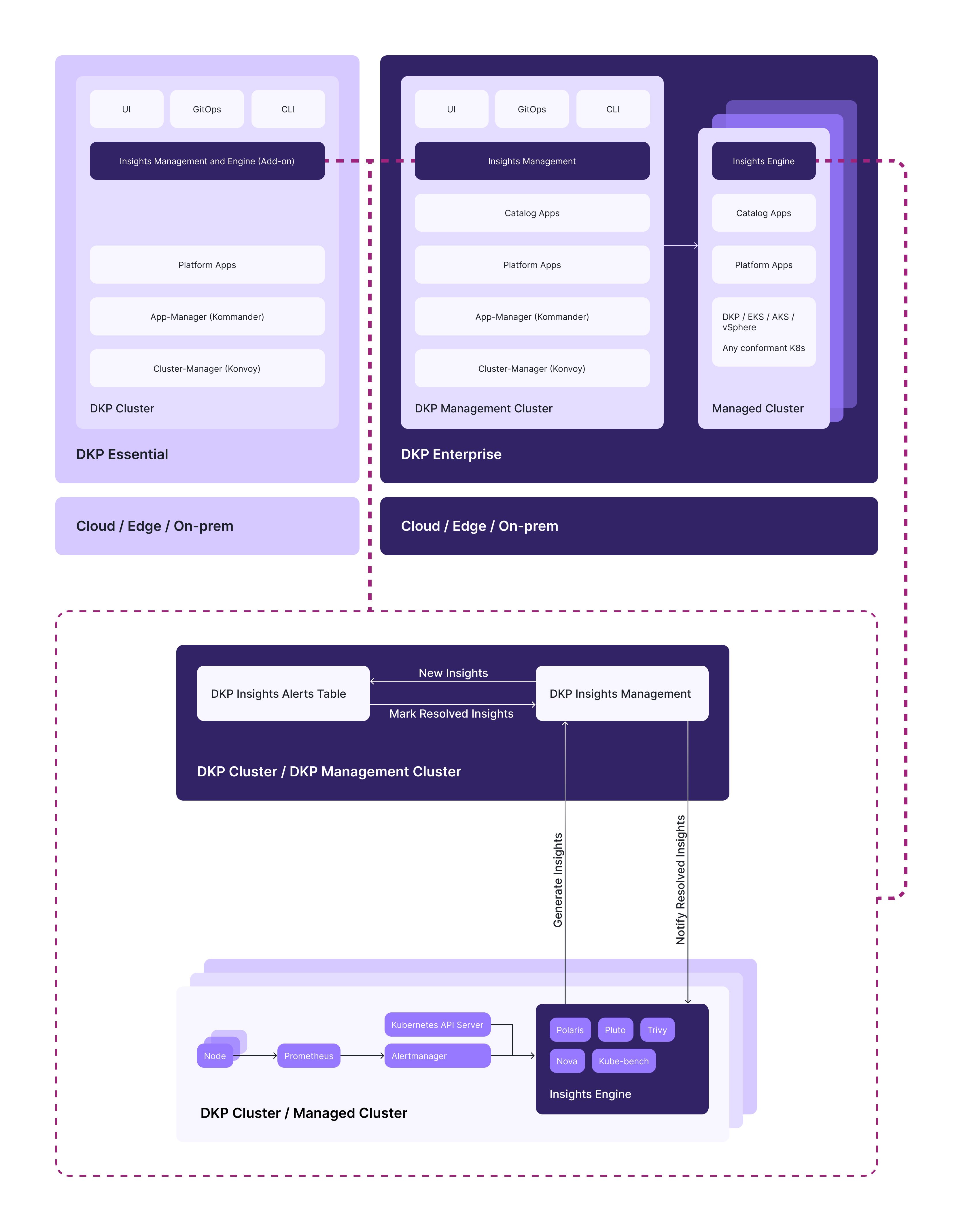 DKP Insights Engine runs on each Attached or Managed Kubernetes cluster, or on the DKP Management cluster for DKP Essential (single-cluster environments) customers.