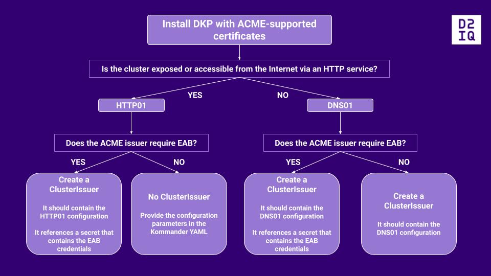 When you enable ACME, by default DKP generates an ACME-supported certificate with an HTTP01 solver that is provided by Let’s Encrypt.