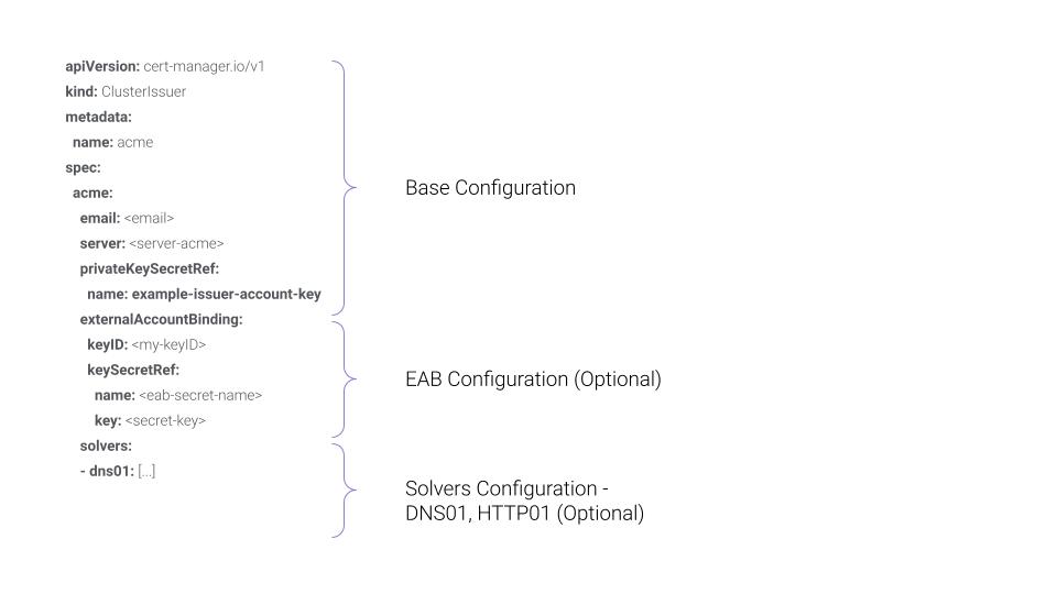 For more information on the available options, refer to the ACME section in the cert-manager documentation.