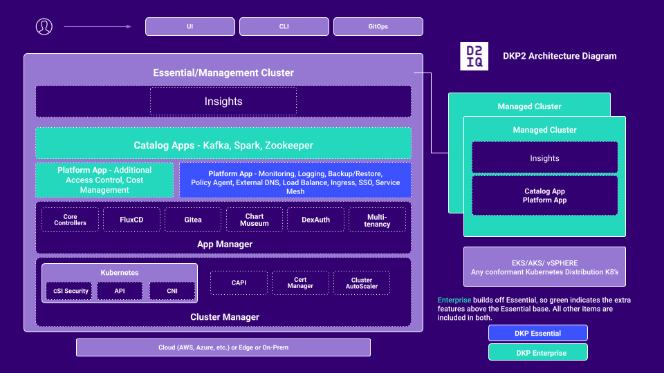 Kubernetes creates the foundation for a DKP cluster. Because of this fundamental relationship, you should be familiar with a few key concepts and terms. The topic in this section gives a brief overview of the native Kubernetes architecture, a simplified view of the DKP architecture - both Essential and Enterprise versions. Also, it shows the operational workflow for a DKP cluster.
