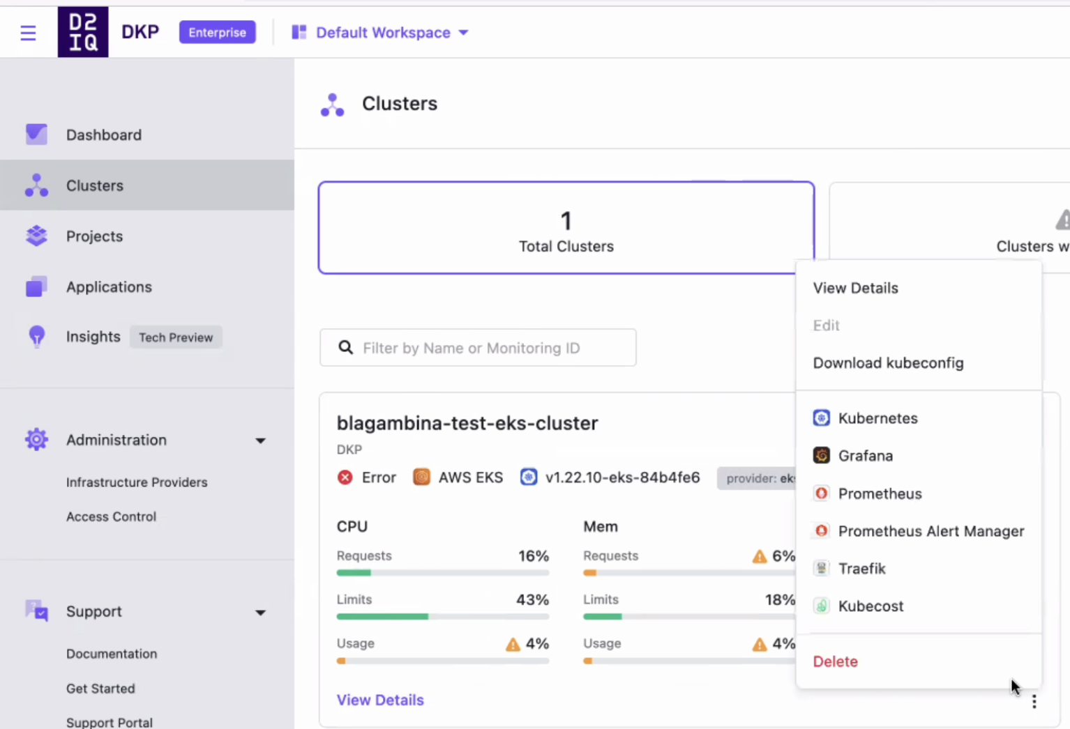 This removes the cluster from the DKP UI. For a generic overview of deleting clusters within the UI as well as troubleshooting, see the Disconnect or Delete Clusters instructions.