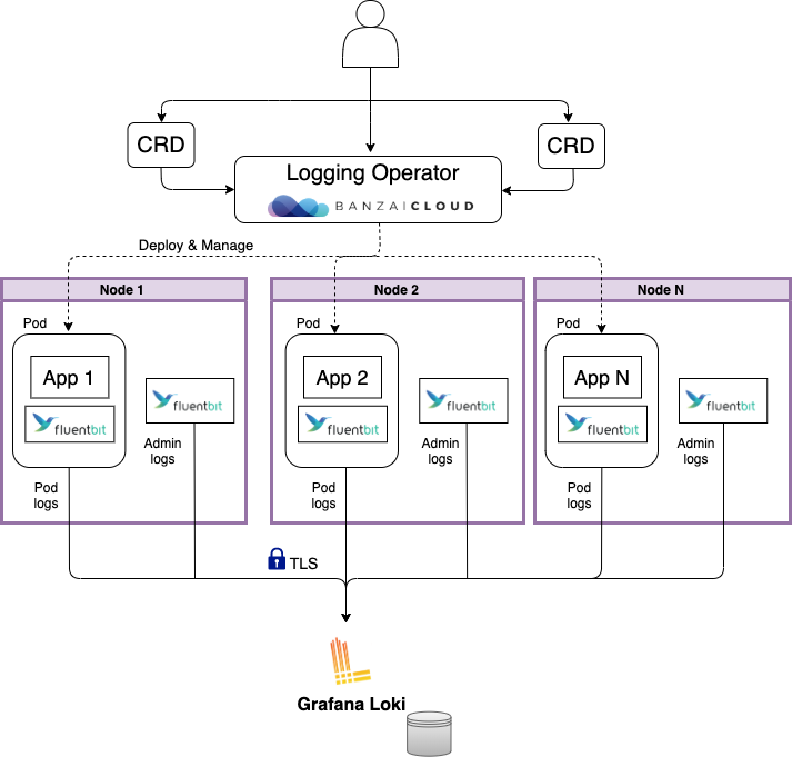 DKP uses the BanzaiCloud Logging-operator to manage the Fluent Bit and Fluentd deployments that collect pod logs, using Kubernetes API extensions called custom resources. The custom resources allow users to declare logging configurations using kubectl commands. The Fluent Bit instance deployed by Logging-operator gathers pod logs data and sends it to Fluentd, which forwards it to the appropriate Grafana Loki servers based on the configuration defined in custom resources.