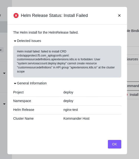 If an error occurs with the Helm Releases charts deployment, an “Install Failed” error status appears in the Kommander Host Field